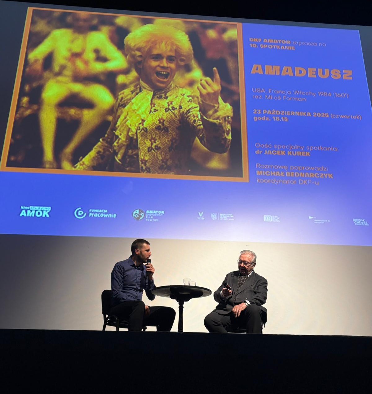 Dnia 30 września 2025 odwiedził nas Krzysztof Zanussi, który spotkał się z publicznością przed pokazem swojego filmu z 1984 roku "Bilans kwartalny". Spotkanie rozpoczęliśmy rozmową z reżyserem, którą poprowadził koordynator DKFu i inicjator wydarzenia Michał Bednarczyk. Po seansie odbyła się dyskusja z udziałem publiczności, podczas której nasz Gość specjalny chętnie odpowiadał na pytania widzów 🙂 Cudownie było patrzeć na wypełnioną po brzegi salę kina Amok! Padł rekord frekwencyjny naszego DKFu❗️ Dziękujemy Państwu za liczne przybycie i za udział w dyskusji! 🎭